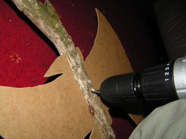 Empuje ahora el MDF hacha cabeza a través de la ranura que usted ha creado. Ahora, usando la broca de 10mm que es el mismo tamaño que el taco, perfore un agujero a través del mango para que pase a través de la ranura y cabeza de hacha de madera mientras que el eje está montado.