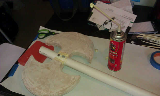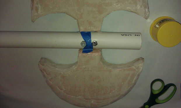 2. Aunque se atornillan, el cabeza de hacha puede todavía cambiar alrededor un poco. Para estabilizarlo más, rellenar las piezas de PVC alrededor de la cuchilla con espuma de grandes cosas. Tenga en cuenta que se expande la espuma, así que asegúrese de dejar espacio para que lo hagan. Si te mueves rápidamente, debe ser capaz de limpiar extra antes de que se seque.