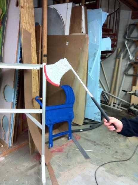 estoy en una producción de Noises Off y uno de los apoyos necesitados es un hacha de bombero. La solución propuesta fue tomar un plástico woods mans hacha del mago de Oz y poner algunos rojo pintura en él. El resultado fue... bueno... pasable tal vez