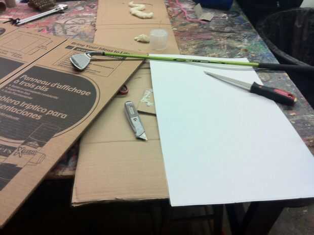 Se necesita un cuchillo del exacto, cartulina, pegamento, pintura roja, un antiguo club de golf y papel de aluminio.