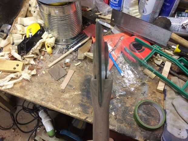 El mango era un poco grueso en comparación con la cabeza de hacha así que algunos el exceso haciendo el mango al ras con los lados de la cabeza del hacha. Yo también había refinado la curva en el hombro del tirador por lo que cabe muy bien la cabeza del hacha.