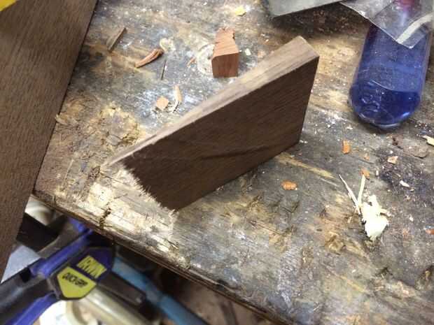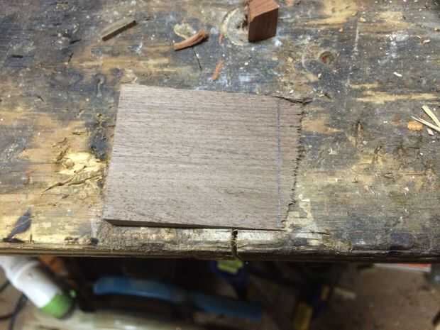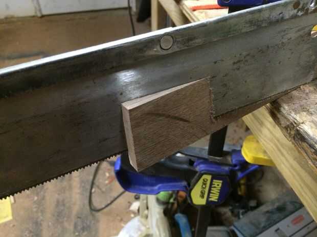 Para este paso que necesitaba cortar una cuña que se utilizarían para fijar la cabeza del hacha a la manija. Mi cuña es una 1/2" de grosor en la parte superior con un cono de 2-3". La anchura fue cortada abajo para ser el tamaño exacto de mis ojos de cabeza de hacha. Utilicé un cuadrado de la velocidad para marcar donde necesitaba cortar y utilicé una sierra de cola de Milano para hacer el corte. Una vez que la cuña fue cortada cuadrado de la punta de la misma.