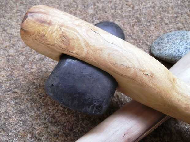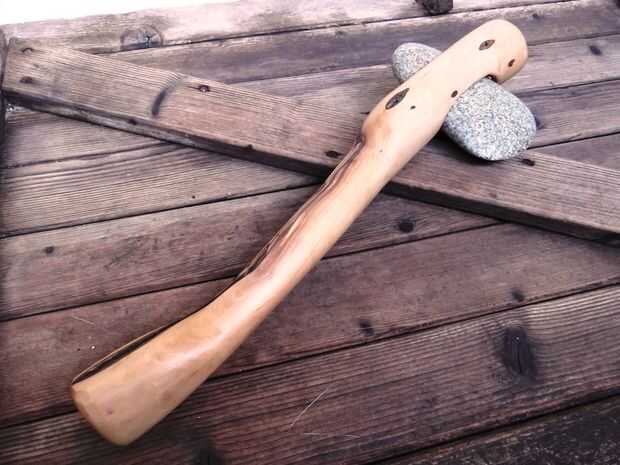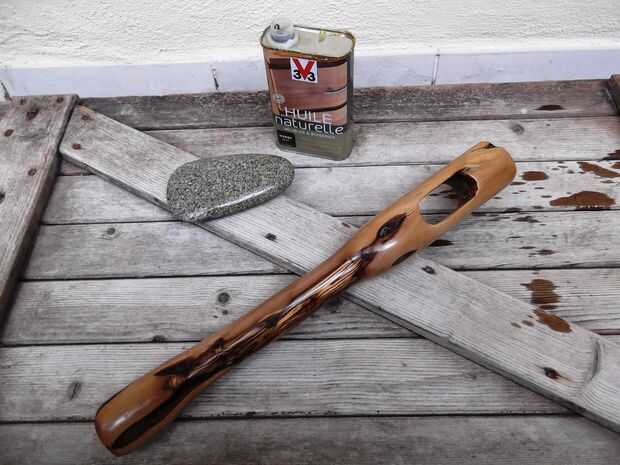 El hacha GROL (granito y oliva) ha sido engrasado con aceite claro, BROL (basalticrock & oliva) con aceite de teca. Aceite de teca es relativamente oscura y da un excelente acabado a la madera. Traer en con las manos desnudas - siente la fuerza! - y limpie el exceso de aceite con una toalla.