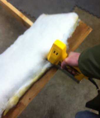 Nota: Encontrar el relleno correcto puede ser la parte más delicada de este proyecto. Para mi cojín usé una combinación de 2 cojines de un sofá más pequeño envuelto en una almohadilla de tipo cartón de huevo fina (cartón lateral hacia el interior). Solía espuma pisos contrapiso (doblado en las esquinas) debajo de la cubierta de la silla base alrededor del armazón del asiento y el respaldar rellena el contorno de la tapa y darle la calesa un aspecto menos rígido. Almohadillas de espuma son tan agradables que alrededor pero son difíciles de recursos. Siempre mantengo mis ojos abiertos para contenedor-limite los muebles con cojines, sobre todo si se hizo en los últimos 20 años más o menos. Muchas veces me parece que aunque un sofá «libre» se ve golpe, suele haber una capa extra de protección bajo la tela de tapicería exterior que mantiene a los cojines de espuma debajo de if mucho utilizable no totalmente vírgenes, siempre y cuando no han sido seriamente trabajados o hizo pis en una CAT desconsiderado (ick).