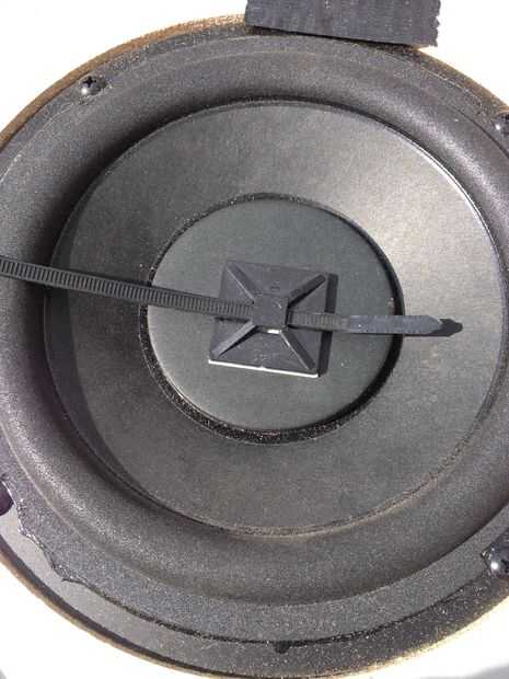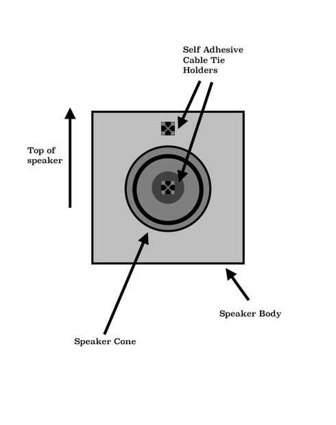Para modificar el orador necesita tener los titulares de lazo del uno mismo cable adhesivo y pegar uno de ellos el cono del altavoz y el otro sobre el cono del altavoz en el cuerpo del altavoz. El diagrama anterior identifica las posiciones correctas.