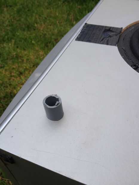 Después de haber hecho esto, tome el tubo de plástico duro y cortar una pequeña sección del extremo (1,5 cm - 3 cm dependiendo de la profundidad de su cono del altavoz). Esto actuará como un espaciador para la tubería en el lugar correcto.