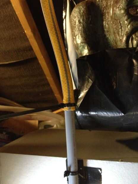 A continuación, conecte la manguera de jardín al tubo de plástico sólido empujando sobre el final y asegurar que con ambos el tercer lazo de cable (como en la imagen) o una abrazadera.