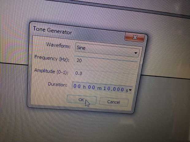 Esto es eran se necesita un poco de experimentación. Un buen lugar para empezar es de 20 Hz que puede o no puede ser capaz de escuchar como los seres humanos sólo pueden oír de cerca de 20 hertzios a unos 20.000 Hz. Una vez que ha escrito 20 Hz en la sección de frecuencia Asegúrese de que la amplitud se encuentra a 0,8 y la duración se establece en como desea el efecto a (es decir, 30 segundos, 1 minuto). Una vez todo listo Presione "OK".