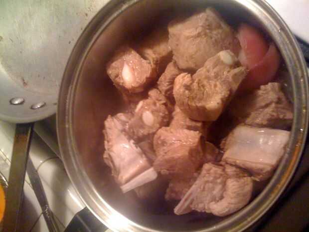 Poner una taza de agua en una olla. Añadir las costillas y la mitad de una cebolla. Cubrir la olla, poner a hervir y dejar cocer durante unos 20 minutos.