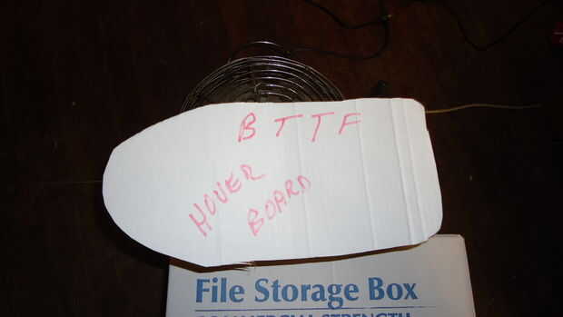Quería conseguir un tablero para flotar, así que cortó un trozo de cartón en forma de un tablero de la libración y grabó algunos picadura fina en la parte inferior y atados los dos extremos de la cuerda a una pata de silla y mesa. Luego coloca un ventilador debajo de la y enciende el ventilador. Esto lo dio el efecto asoma que quería después de mover la silla en varias posiciones para llegar a la Junta a suspender para el video.