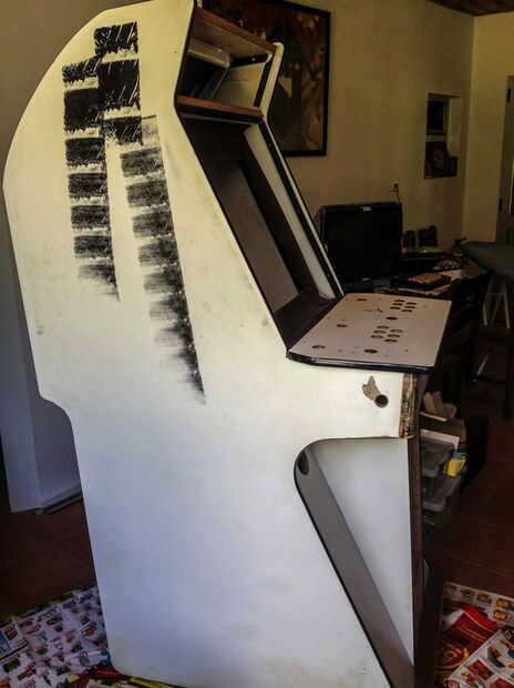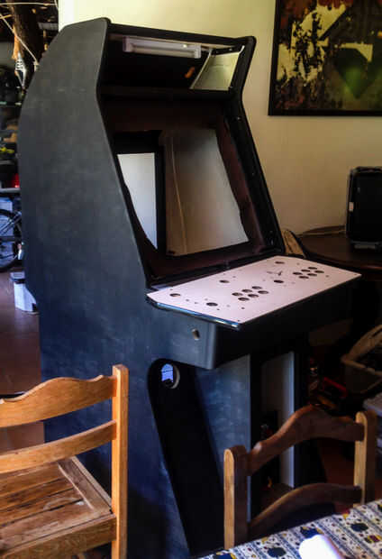 Aviso que ya habia abierto los nuevos agujeros para los altavoces en un lugar más o menos oculto, debajo de la zona de la palanca de mando. Los altavoces utilizados eran altavoces de ordenador convencionales que desmantelaron y aplicado en el gabinete. El control de sonido y botón de encendido hasta ahora están disponibles debajo de la zona de joystick y botones.