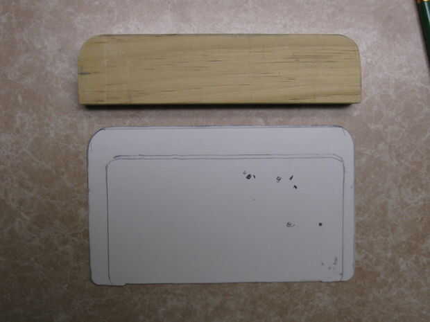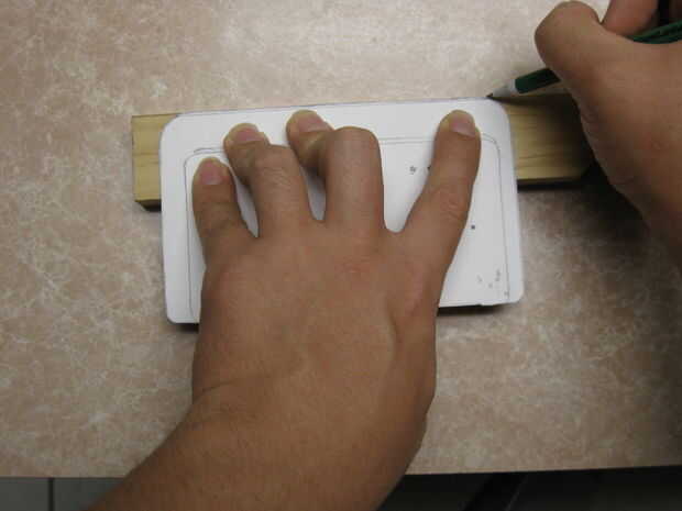 Tomar su patrón de cartulina y recortar la línea XL. Usted va ser quitar completamente el cartón sobrante alrededor del perímetro. Ahora coge ese pedazo de chatarra 1 X 2" pino o MDF y coloque su cartulina recorte sobre él. Alinee el borde superior del patrón a ras con el borde superior de la madera. Trace una línea alrededor de los dos lados y luego retire la pieza de tablero de tarjeta. En el interior de la pieza la etiqueta que lado es cual. Ya que existe la posibilidad de que el cartón cortado no es perfectamente simétrica es importante etiquetar los lados.