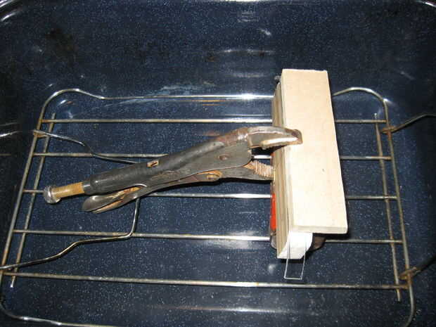 Ahora que todo está sujeta, lo único que necesitas es calor para formar las curvas. Si su uso de una abrazadera de metal obviamente se va a poner muy caliente, así que necesita un guante de horno para sacarlo. Te recomiendo un guante sobre un toalla/trapo ya que sólo tiene un corto periodo de tiempo cuando trabajo con el acrílico antes de que se endurezca otra vez. Será mucho más fácil de manejar la llave/pinza con un guante.