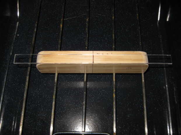 Como se puede ver mi plexiglás ya está doblado hacia abajo. La razón fue que era porque esperaba que el calor del horno gradualmente reduciría los lados en un mismo formando de manera. Gravedad no ganó así que improvisé el tirante y la abrazadera.