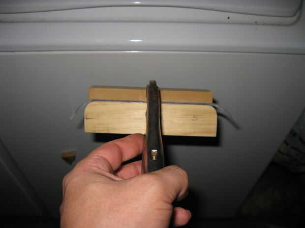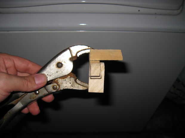Alinee el plexiglás empotrado contra una arista de la pieza de madera, preferiblemente el lado indicado que había a la izquierda y derecha. Centro de ambas líneas en el plexiglás y la pieza de madera. Ahora toma tu llave y colóquela sobre el plexiglás. Ahora debería tener un sándwich delicioso del plexiglás. Agarra un par de mordazas de tornillo de carpintero o una abrazadera en C y sujete todos juntos. Si es necesario realinear los trozos.