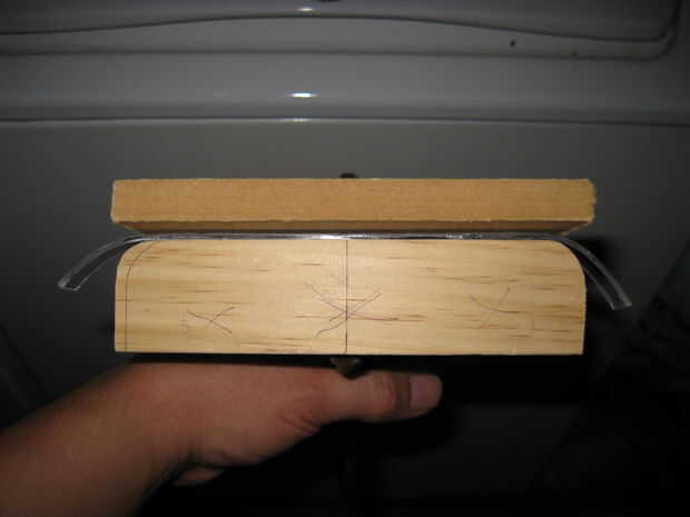 Si tienes alguna más piezas de desecho de madera ahora es el momento de batir hacia fuera. Crear una pieza más o menos largo la curva superior de su forma lo suficientemente amplia como para cubrir totalmente el ancho de plexiglás y madera.