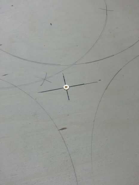 Ya había hecho esto cuando dibujé el círculo inicial en la parte superior de la Junta. He terminado el agujero piloto y poner un tornillo todo a través de la forma a utilizar como punto de pivote.
