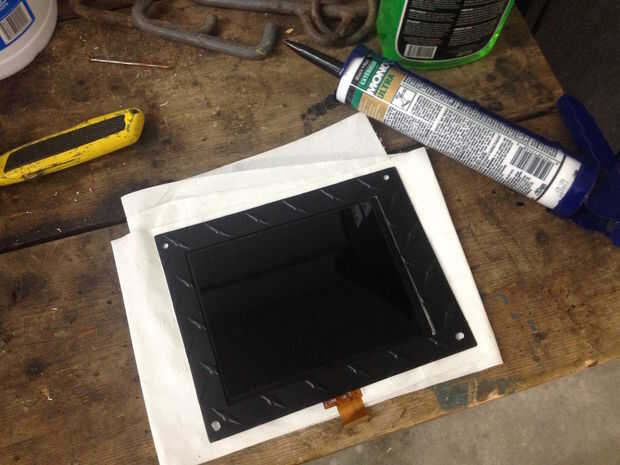 La pantalla plana física fue unida del soporte metálico en el primero usando cinta buena ol ', entonces, una vez temporalmente colocado en el bisel y verificado como perfectamente centrado, utilicé adhesivo PL (¡ con moderación!) para garantizar desde la parte posterior.