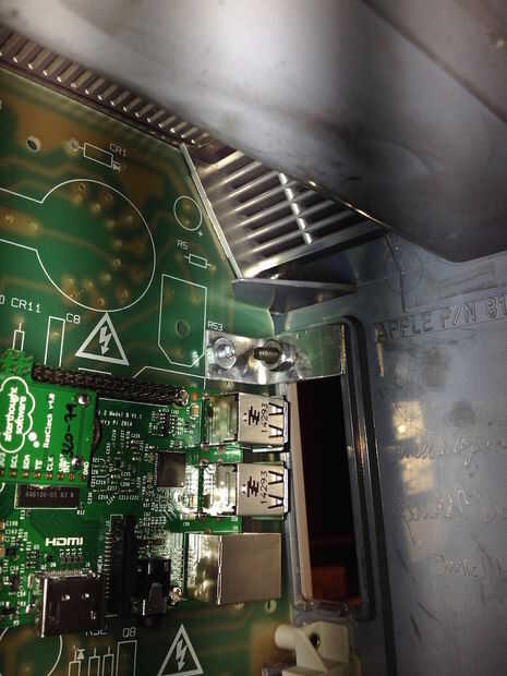 Montara el margen justo de frambuesa Pi de la original puerta de batería PRAM en la parte trasera de la caja, así que puedo acceder a sus puertos USB y Ethernet sin tener que abrir el caso él necesidad surgiera.