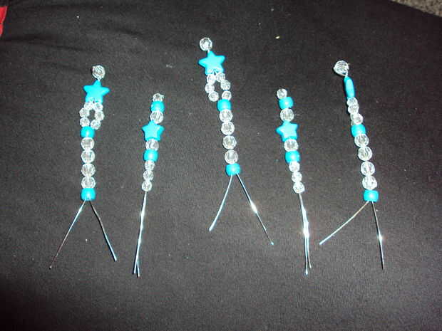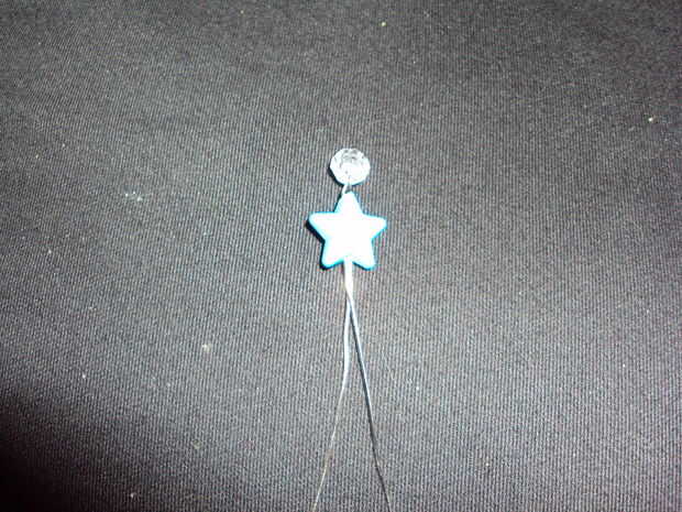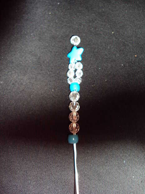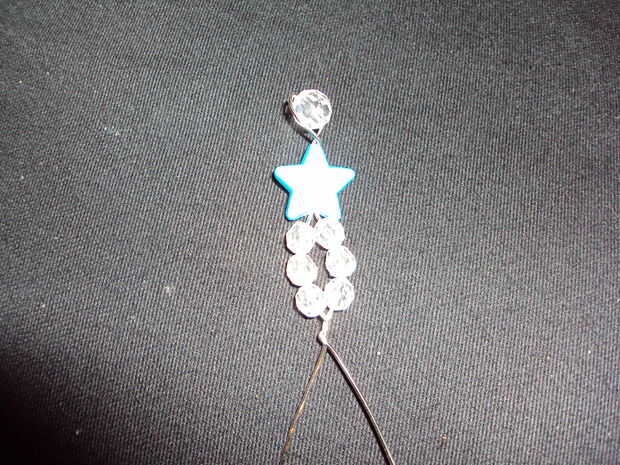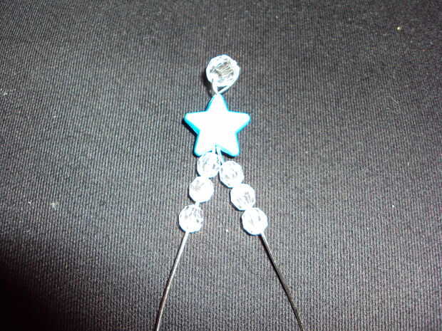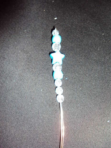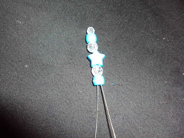 Con los dos cables juntos, agregar una bola azul pony, que agregar 4 grandes claro los granos y finalmente una última bola de pony azul.