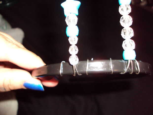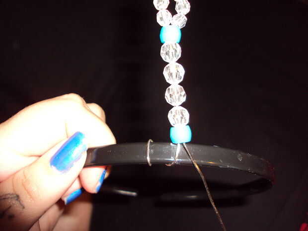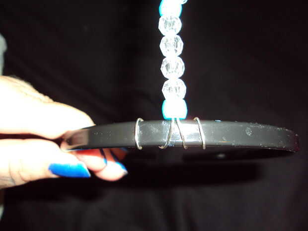 Coloque el talón inferior derecha por encima de la banda de la cabeza con los cables en la parte delantera. Cuidadosamente, enrolle el cable alrededor de la parte posterior al frente otra vez. Hacer esto para dos cables de cada pieza.