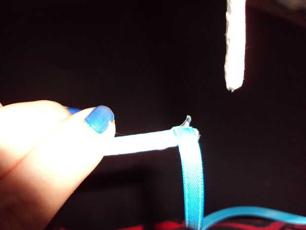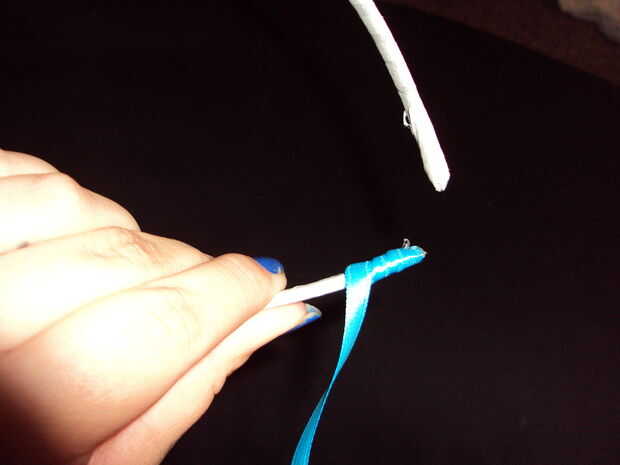 Poner un poco de pegamento en el extremo de la cinta y pegue la cinta a él. Una vez pegado, ponga sobre una mitad de pulgada de cola en la parte posterior de la banda de cabeza. Yo no haría más que esto en un momento porque se fijó en usted.