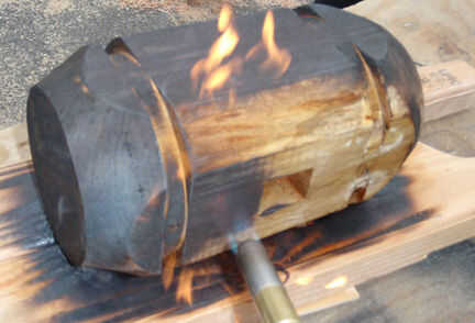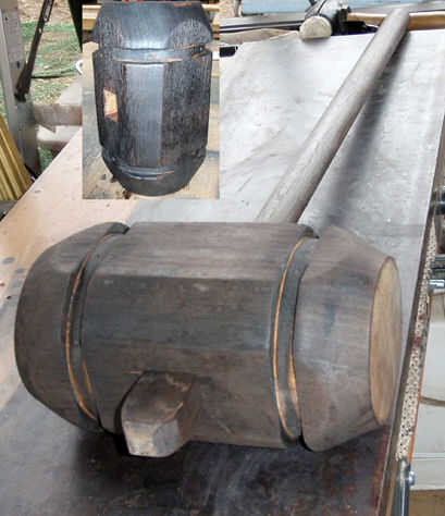 La cabeza está recubierta de parafina y bandas de metal unen la cabeza para evitar grietas durante el cambio de clima de Japón aquí. Quite las vendas de metal antes de quemar la cera la cabeza. La parte superior del mango se forma con una sierra y luego también se quema. Cuando ambos son lo suficientemente frías para manejar cepillarlos con un cepillo de alambre a lo largo de la veta de la madera.  Deslice la cabeza al mango. El mango es levemente acuncado en la parte superior para que la cabeza sólo cabe una manera correctamente. Presión entra en la cabeza dejando caer repetidamente la parte superior de la manija verticalmente en el suelo. Esto forzará la cabeza a la misma cuña firmemente al mango. Pre taladro y atornillar para fijar la cabeza.