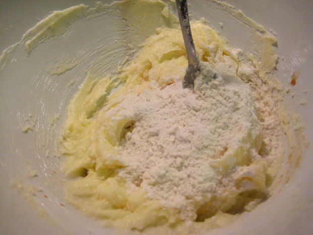 Añadir la mezcla de harina a la mezcla de mantequilla en cuotas. (No volcar toda la mezcla de harina en la mezcla de mantequilla al mismo tiempo!!!!!!) Incorpore la mezcla de harina hasta que apenas se combina y repetir con el resto de la harina. Overmixing y agitando con demasiado vigor se hacen las galletas duras, así que trate de ser tan suave como sea posible!