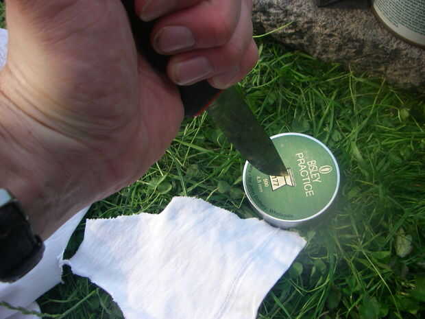 Uno de mis scouts intentados usar una coca pequeña puede. Después de la primera de ellas derretido, probamos otra vez con un calor más bajo. Había cortada la parte superior de la lata, pegado el material, doblado sobre el centro de la lata para que aproximadamente fue sellado en y poner al fuego. Los resultados fueron los mismos.