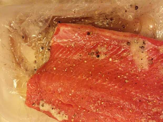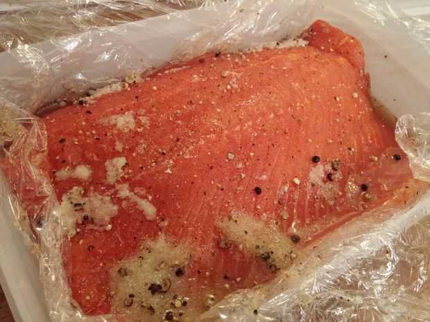 El salmón se quita del envase forrado plástico, habrá mucho líquido allí para descartar. Enjuague suavemente el salmón en agua fría ligeramente. Lave el envase de plástico y coloque el pescado lavado en él. Verter la salmuera sobre el pescado así que está totalmente cubierta y la tapa se vuelve a poner. Etiqueta de la hora y fecha.