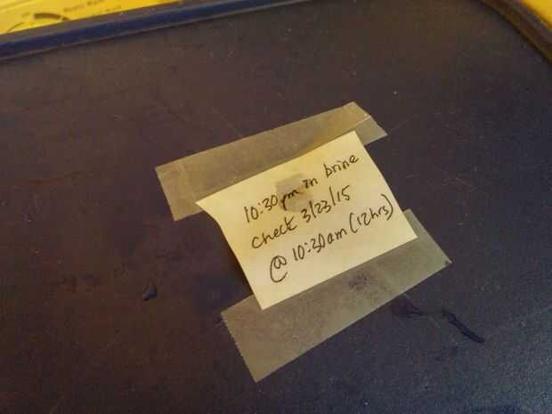 Tenía una receta para una salmuera que pedía 50 libras de salmón de un lugar. Otra recetas era para 5 galones, así que había reducido las cantidades para 1 cuarto de galón de agua. Mayoría de las recetas asume grandes cantidades de pescado porque es tan tiempo intensivo para hacer lox. El pescado se sentará en esta salmuera durante 8-12 horas.