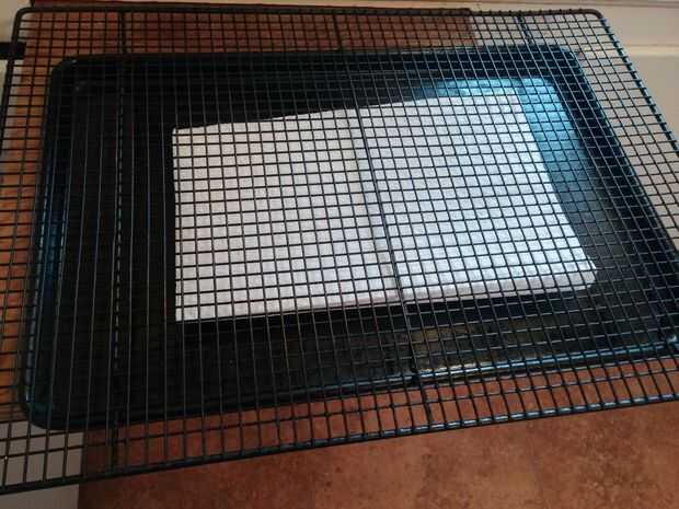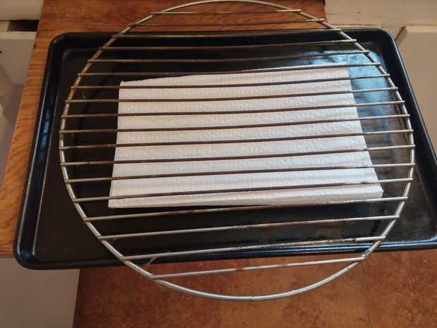 La mejor manera de conseguir el pescado se seque antes de fumar frío es usar un teflón revestido refrigeración galletas sobre una bandeja con papel de cocina en él. No necesita las toallas de papel, pero hace la limpieza mucho más rápido. Retire el pescado del agua y de la palmadita seca en la hoja de secado. También puede utilizar una parrilla limpia en lugar de la galleta forrada de teflón cocinar hoja. Funciona igual de bien.