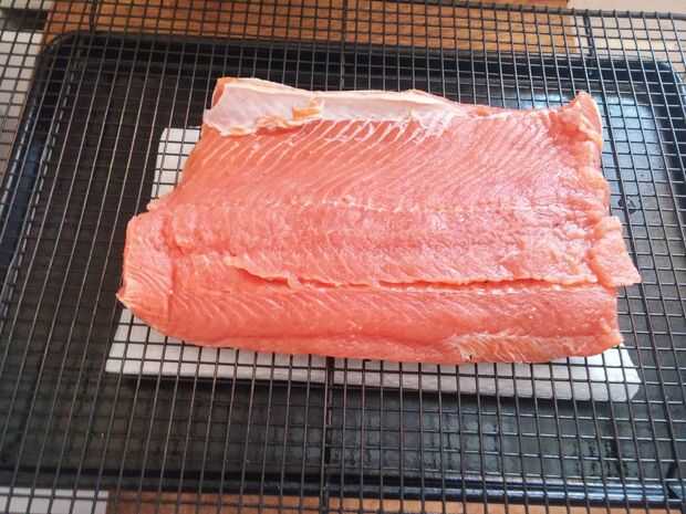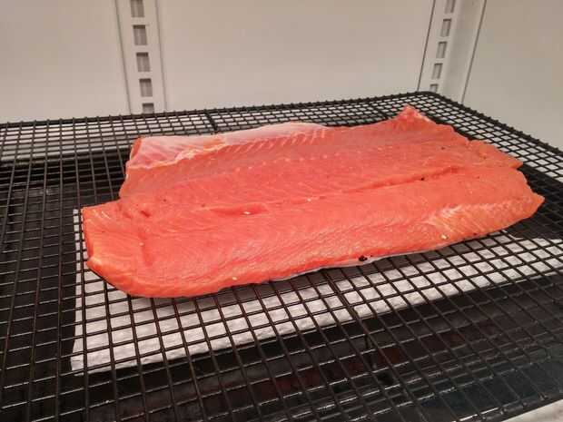 Poner el salmón en la nevera durante unas horas, deje secar durante unas 6 horas. Según otras recetas llaman para secar su pescado para tan poco como 1 hora y como largo como hasta 24 horas.