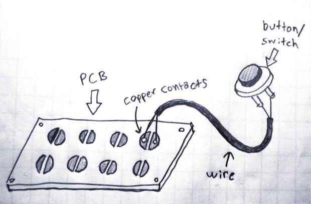 Pero hackear un teléfono existente emplearía uno de mi favoritos trucos simples para modificar electrónica: botón extensiones. Esta técnica es muy simple y permite hacer rápidamente las interacciones realmente extrañas y divertidas con todo tipo de dispositivos electrónicos. Esencialmente, solo crack abrir el dispositivo, quitar switches existentes o botón de membranas, soldar los cables a los cables de cobre y sus propios botones/interruptores a los otros extremos de los cables de la soldadura. Consulte el "diagrama de cable de extensión".