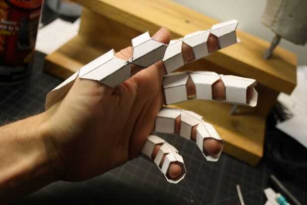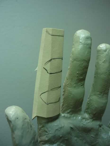 Para la primera maqueta, utilicé una técnica de corte y confección llamada "drapeado", donde esencialmente envuelto el maniquí en cartulina para obtener la forma básica del guante. Entonces, corte las secciones para crear piezas discretas para cada segmento de dedo. Me cortan estos y les aplana hacia fuera para crear un patrón.