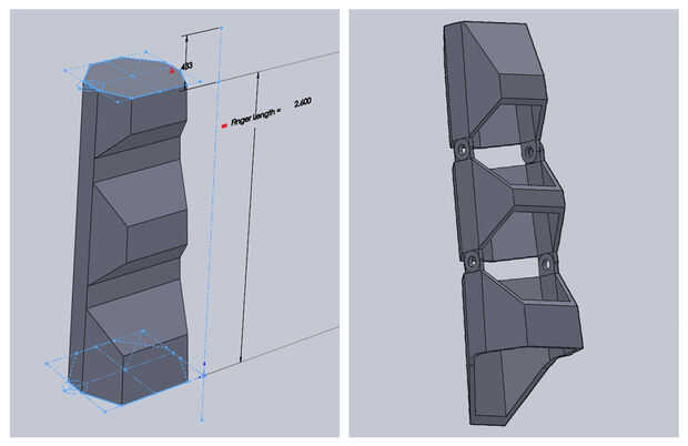 Como yo lo hice con el primer prototipo de papel, decidí crear un dedo de guante y modificar copias de la misma para el resto de los dedos. Porque los componentes externos que todos necesitan para adaptarse a la misma manera, yo simplemente no podía escalar o redimensionar el modelo, como yo lo hice con el patrón de papel. En cambio, tuve que diseñar un modelo de "paramétrico" del dedo. Esencialmente esto significa que el modelo tiene unas dimensiones de raíz que determinan su forma y tamaño, pero cualquier pieza que alberga el hardware o componentes permanece igual. Aquí está un video para demostrar cómo funcionan estos componentes paramétricos: