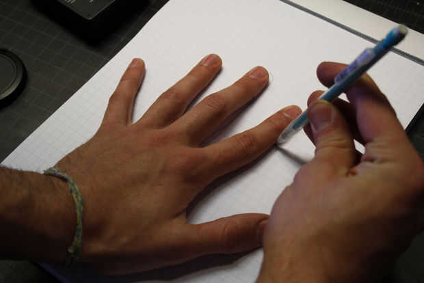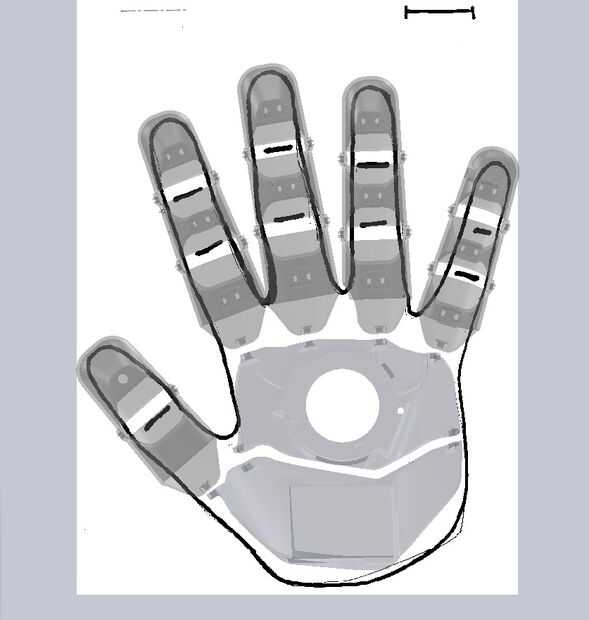 Para asegurarse de que el modelo encajaría en mi mano, he añadido una imagen de referencia simple de mi mano al modelo CAD. Trazó mi mano en un pedazo de papel y llamó a su lado una línea de una pulgada por lo correctamente podría escala de la imagen. Entonces, ajusta las dimensiones de la raíz de los modelos paramétricos hasta cada parte del guante... como un guante!