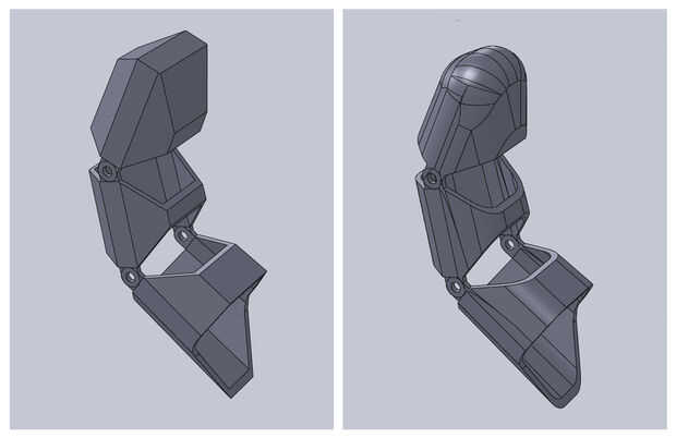 Había iniciado por la geometría de la parte superior e inferior de los dedos de papel de dibujo, luego hizo una protuberancia tipo loft entre los dos dibujos. Después de las formas básicas de modelado, solía una característica llamada "shell" hueco cortes ellos, sacados, y "filetes" para redondear esquinas y superficies lisas.