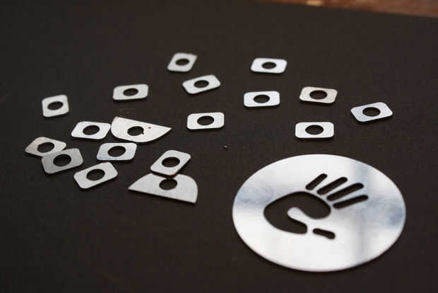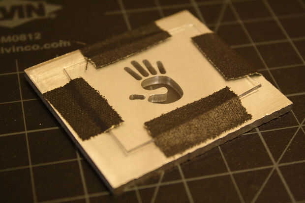 Para algunos otros componentes, como las placas de metal que encajan sobre los botones de dedo, usé un escritorio molino CNC a las formas de la máquina de metal de hoja. Un buen amigo y mentor Frankie Flood - Compruebe hacia fuera su increíble trabajo aquí - déjeme usar parte de su equipo para fabricar estos componentes. Si no tienes acceso a un molino CNC, Ponoko ofrece también servicios para diseños personalizados de corte de chapa de acero inoxidable.
