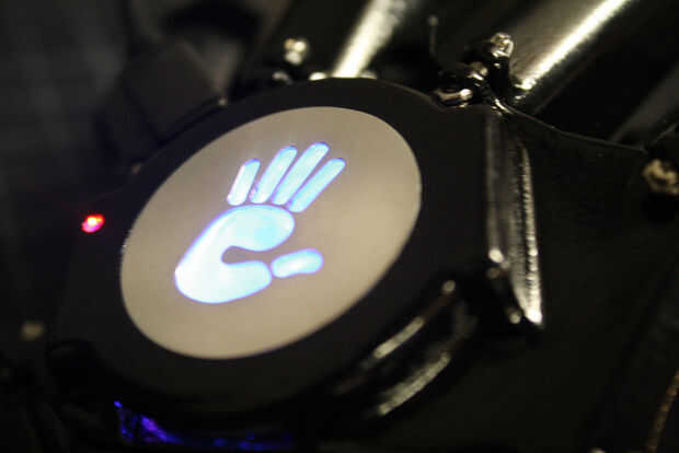 También utilicé un cortador láser para crear la cubierta trasera que tiene el circuito y los cables en la placa de la mano superior.