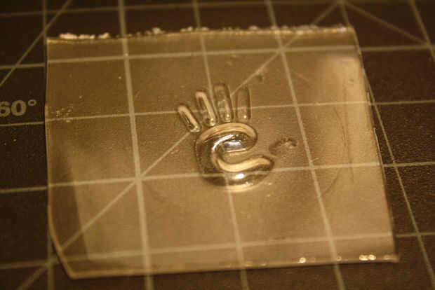 Para esto, mecanizan un logo de mano extra fuera de un pedazo grueso de aluminio, y usando un trozo de plástico PETG (sobra de otro proyecto) creé un poco repujado termoformado para colocar bajo la insignia del metal de hoja. Era tan sencillo como grabar el plástico sobre el troquel de aluminio, ablandar para arriba con una pistola de calor y utilizando un pedazo de espuma de artesanía para empujar el PETG ablandada en el dado. Botón fantasía instantánea-thingie!