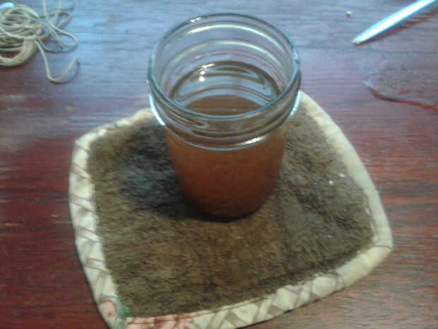 Aquí es donde haces tu tarro de inmersión. Tomar su vaso jarra o vaso y romper lo suficiente de la cera de abejas para que la jarra es la mitad a tres cuartos completos y colocarlo en el microondas. Ejecutar en primera alta durante 2 minutos y luego utilice incrementos de 1 minuto hasta que la cera se derrita totalmente como se ve en la imagen. Recuerde que debe utilizar una toalla o almohadilla térmica, como el vidrio será muy caliente!