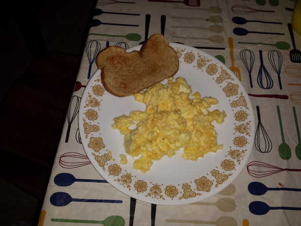 este es un desayuno comer todas las mañanas que es muy fácil de hacer.Paso 1: equipo de Lo que usted necesita:* Un pan* 2 huevos* Una espátula* Queso Cottage* Canela* Avena (opcional)Paso 2: Huevos revueltos Romper los huevos en la sartén y ponga la