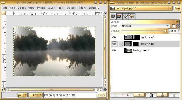 En la capa máscara de capa "izquierda a derecha", dibuje un gradiente de exactamente 2/3 de la imagen, hasta el límite de la derecha de la imagen. (o puede también "derecha izquierda" copia de máscara y pegar en "izquierda a derecha" de la máscara y Voltear horizontalmente)