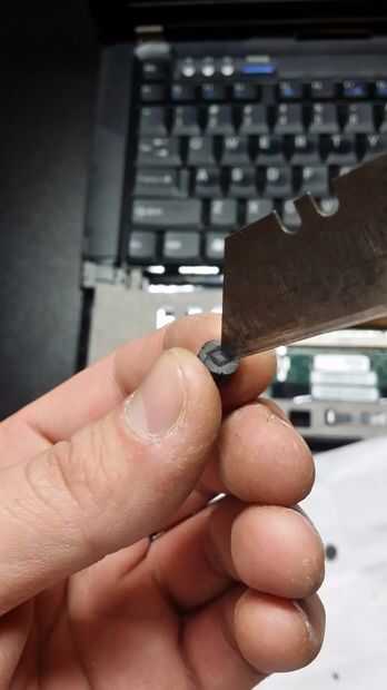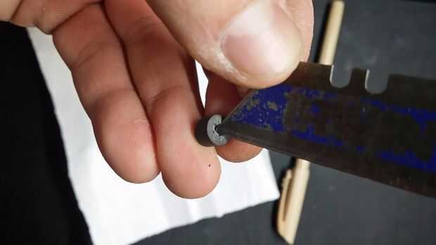 Cortar el cuadrado marcado en la parte plana con la hoja,! tener realmente cuidado aquí!, usted no quiere a cortar todo camino, porque ellos no agarre la pieza al palo, y también no quiere cortar el dedo:)...