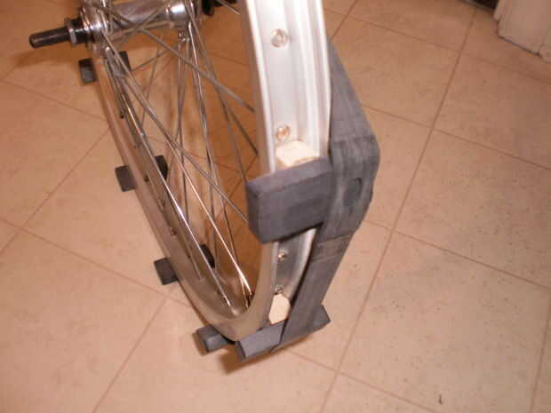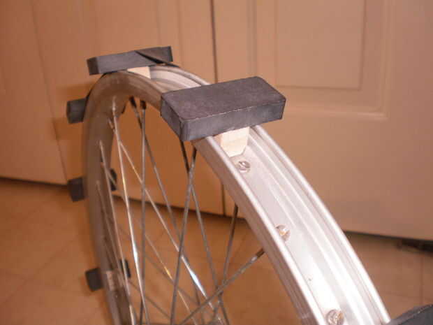 Dependiendo de la forma de la llanta de bicicleta, pueden tener que cortar los bloques de tilo para caber dentro del canal de la rueda. Consulte las fotos para entender lo que quiero decir. Desea que la madera para encajar perfectamente en el borde mientras el imán se encuentra ajustado a la llanta. Diseñé la rueda de 16 pulgadas para trabajar con 12 imanes de C8. Para espacio uniformemente el pegamento el primer imán en su lugar sobre el agujero en el borde (el agujero para la espiga del tubo interno). Esta llanta tiene 18 rayos por lado, 36 en total. Eso significa que usted debe tener 3 cabezas habló entre cada imán. Si usted tiene cuidado, puede hacerlo por el ojo. Utilizar abundante pegamento en los bloques de madera y presiónelas en su lugar todos cabezas de 3 radios. Dejar secar completamente. Cuando los 12 imanes en su lugar, tomar el protector de llanta de goma y estiramiento sobre los imanes. Esto le ayudará a mantener los imanes en su lugar y protegerlos como de la vuelta.