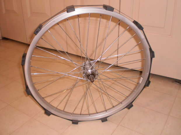 Hagamos primero la única parte móvil de la máquina de Bedini. Tome la llanta de bicicleta no magnético y asegúrese de que esté completamente limpio y recto. Recibí mi borde de una yarda del salvamento de bici, aunque más tarde compré una simple llanta de 26 pulgadas nuevo de un distribuidor de piezas de moto online. Además de ser limpio y verdadero, lo más importante de la rueda es que gire tan libremente como sea posible. Nuevo o usado, tendrás que limpiar los rodamientos. Grasa de bicicleta es demasiado gruesa para nuestro propósito, así que desmonte el cubo de la rueda y salir todo el lubricante pesado. Rocíe el limpiamos rodamientos y el eje con una silicona ligera o lubricante WD40. Vuelva a montar el cubo, pero no apriete las tuercas del eje demasiado apretadas. Mantenga el cubo de bamboleo, pero dejar que gira tan libremente como sea posible.