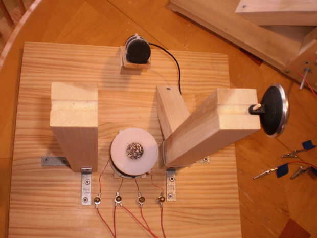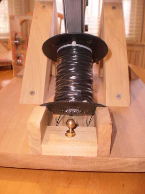 La bobina debe montarse en el centro de la base, ángulo recto entre montantes. Corte largo dos cortos del basswood 3/8 pulgadas 3 pulgadas de largo. Pegamento a la parte inferior de la bobina a cada lado de la base. Evitar que los extremos de los hilos de la cola, luego usar más pegamento para pegar la bobina en la base. Coloque los cables de cuatro hilos corriendo por el mismo lado. Deje que todo se seque.