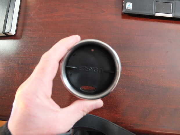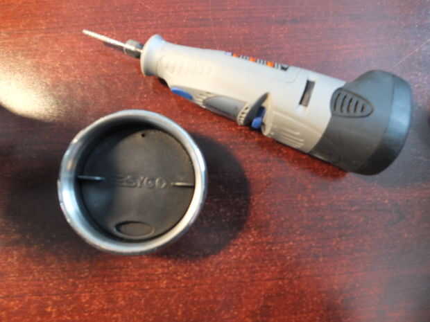 Ahora perfore el agujero para ensanchar el agujero, taladro desde el otro lado, limpiar el plástico deshilachado de los bordes y listo! Agujero más grande significa que ninguna aspiración para impedir el flujo de café y no molesto silbido.