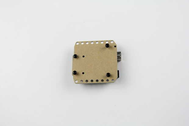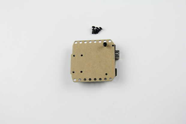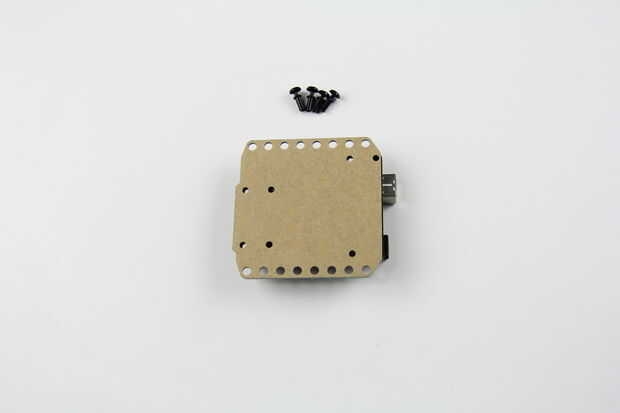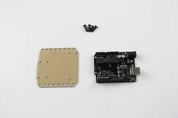 15. Inserte un R3075 remache de plástico en los agujeros en el Arduino y el soporte de acrílico del Arduino.